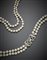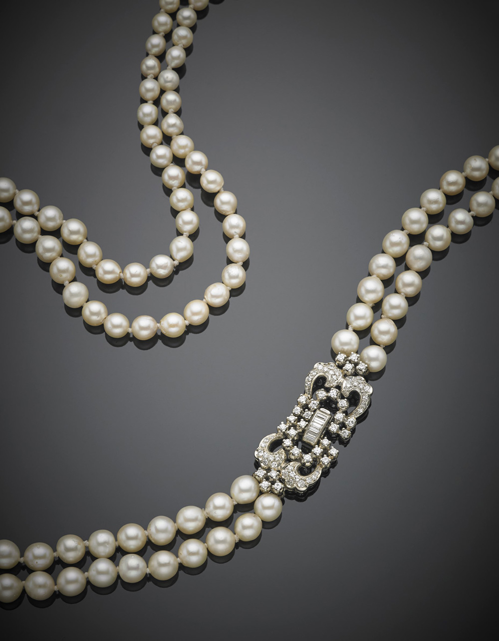 Collana a due fili di perle coltivate bianche a scalare da mm 5,50 a mm 10,50 circa, con chiusura in oro bianco con diamanti rotondi e a baguette, g.110,90, collana lungh. cm 79 circa Two strand white graduated cultured pearl necklace from mm 5,50 to mm 10,50 with white gold diamond clasp, g.110,90, length cm 79 circa
