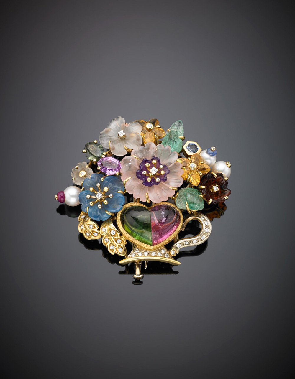 MARIANI-Monza Broche e/o centrale per collier, in oro bianco e giallo a guisa di cesto fiorito con vaso a forma di cuore, formato da tormaline verdi e rosa rifinito con diamanti, perle ed altre gemme alcune scolpite, g. 35,10, largh. cm 5,5 MARIANI-Monza Bi-coloured gold diamond, gem and carved gem set flower vase brooch/pendant, width cm 5,5, g. 35,10