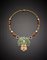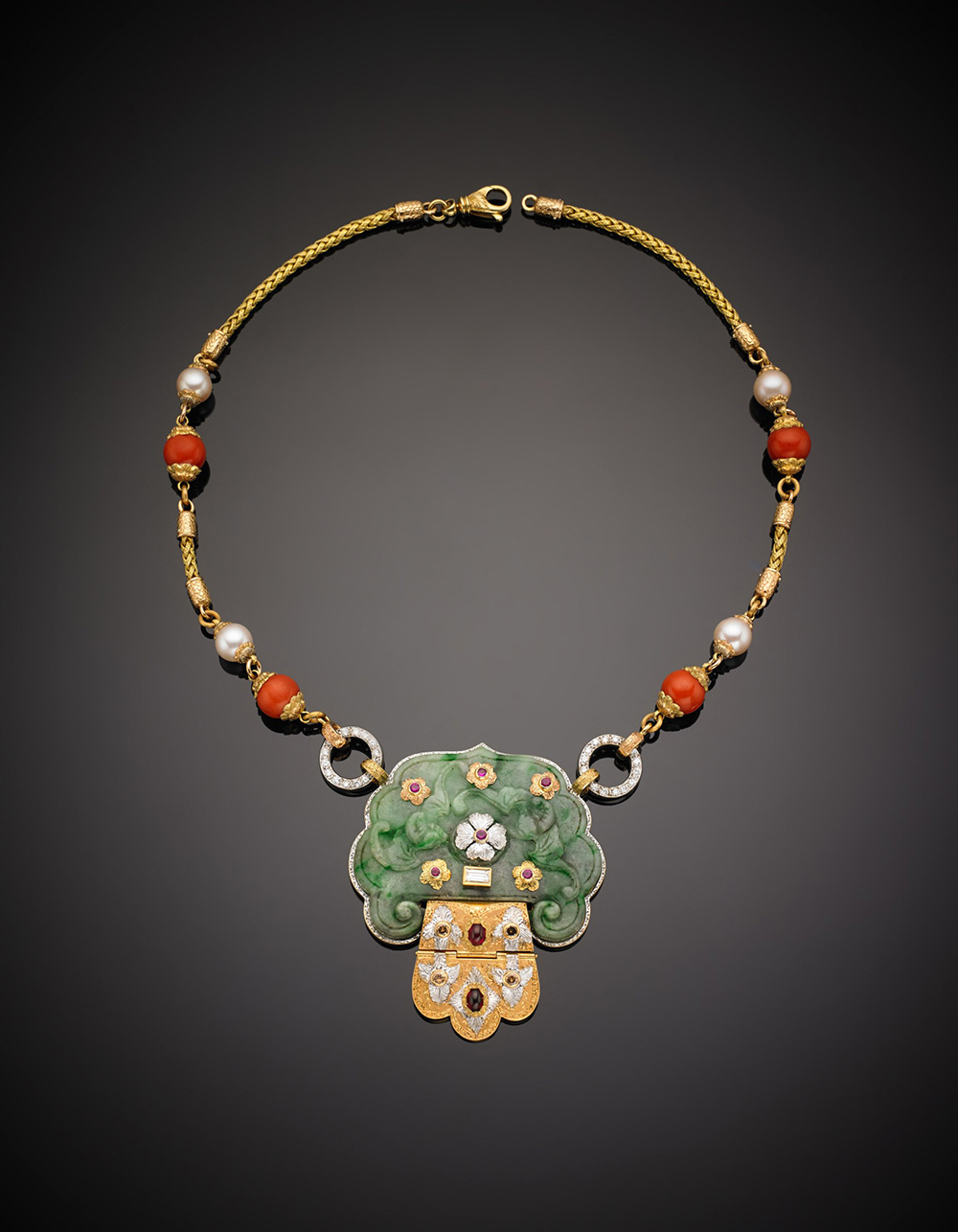 CAZZANIGA Collier in oro bianco, giallo e rosa cesellato, con grande centrale in giadaite scolpita, corallo, perle, rubini e diamanti incolori e fancy , g. 144,60, lungh. cm 48,5 circa, lungh. centrale cm 7,5 largh. cm 6,2 circa CAZZANIGA Tri-coloured chiselled gold coral and pearl necklace centered by a large carved jadeite with rubies , colourless and fancy diamonds, g. 144,60, necklace length cm 48,5 circa, central cm 7,5 x cm 6,2 circa