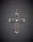 Pendente a forma di croce in oro rosso, giallo e argento con diamanti irregolari taglio mezza rosetta ed altri old mine, rifinita con zaffiri carrè, g.10,60, lungh. cm 6,40 circa con contranello Yellow and red gold, silver, old mine diamond cross pendant, accented with carré sapphires g.10,60, length. cm 6,40 circa