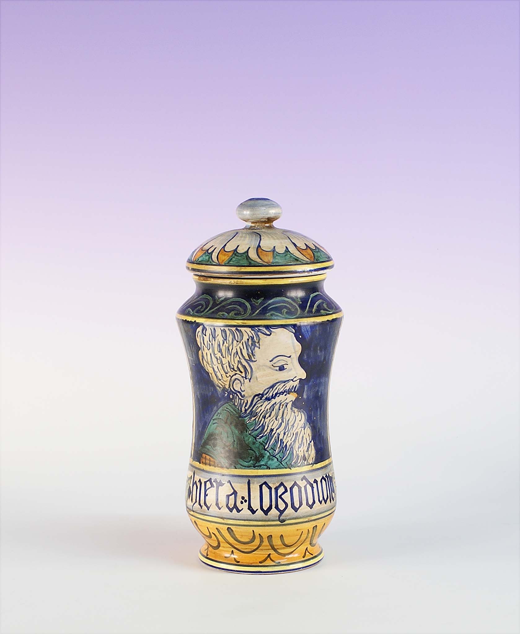 Potiche in maiolica dipinta in policromia, Castelli, vecchia manifattura, h. cm. 26.