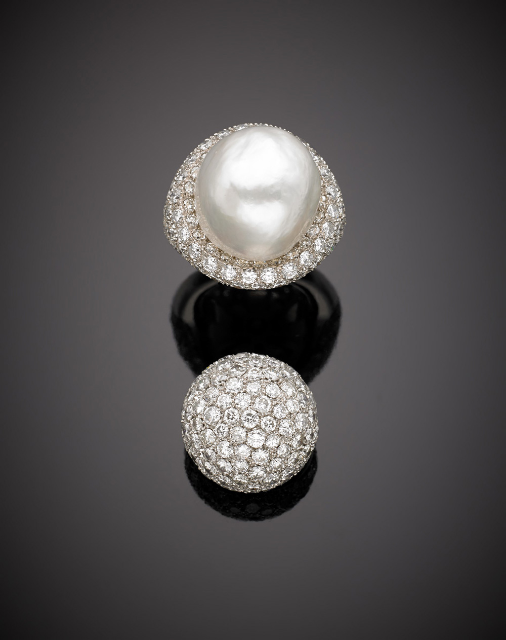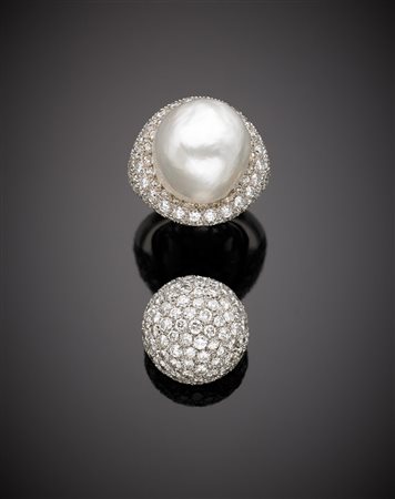 Anello in oro bianco e pavé di diamanti con al centro grande perla coltivata di mm 17,55x16,16x13,70, la quale è sostituibile con pavé di diamanti sempre su oro bianco, complessivi g.21,50, misura 10/50 White gold diamond pavé ring with a great detachable pearl of mm 17,55x16,16x13,70 together with a white gold diamond pavé replacement, in all g.21,50 size 10/50
