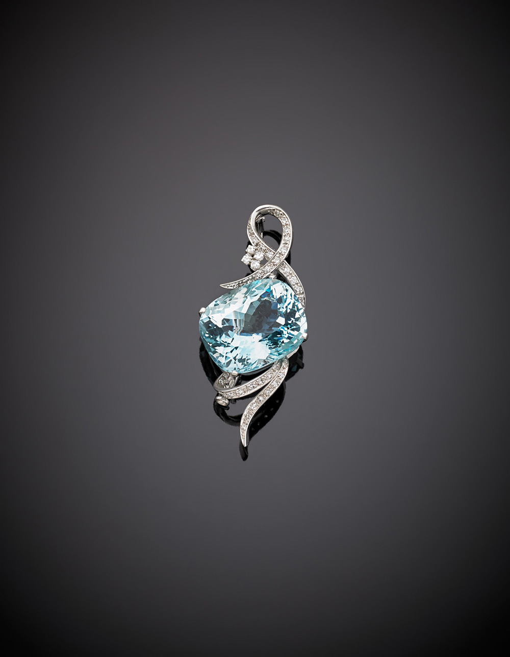 STERN Spilla in oro bianco con diamanti a contornare un'acquamarina forma a cuscino taglio composito di ct.29 circa ,g.12,60, lungh. cm 5 circa Accompagnata da ricevuta originale di acquisto H.STERN COM. E IND. S.A. del 20 maggio 1964 STERN White gold diamond brooch with a cushion cut aquamarine of ct.29 circa Appended original receipt by H.STERN COM. E IND. S.A. 20 may 1964