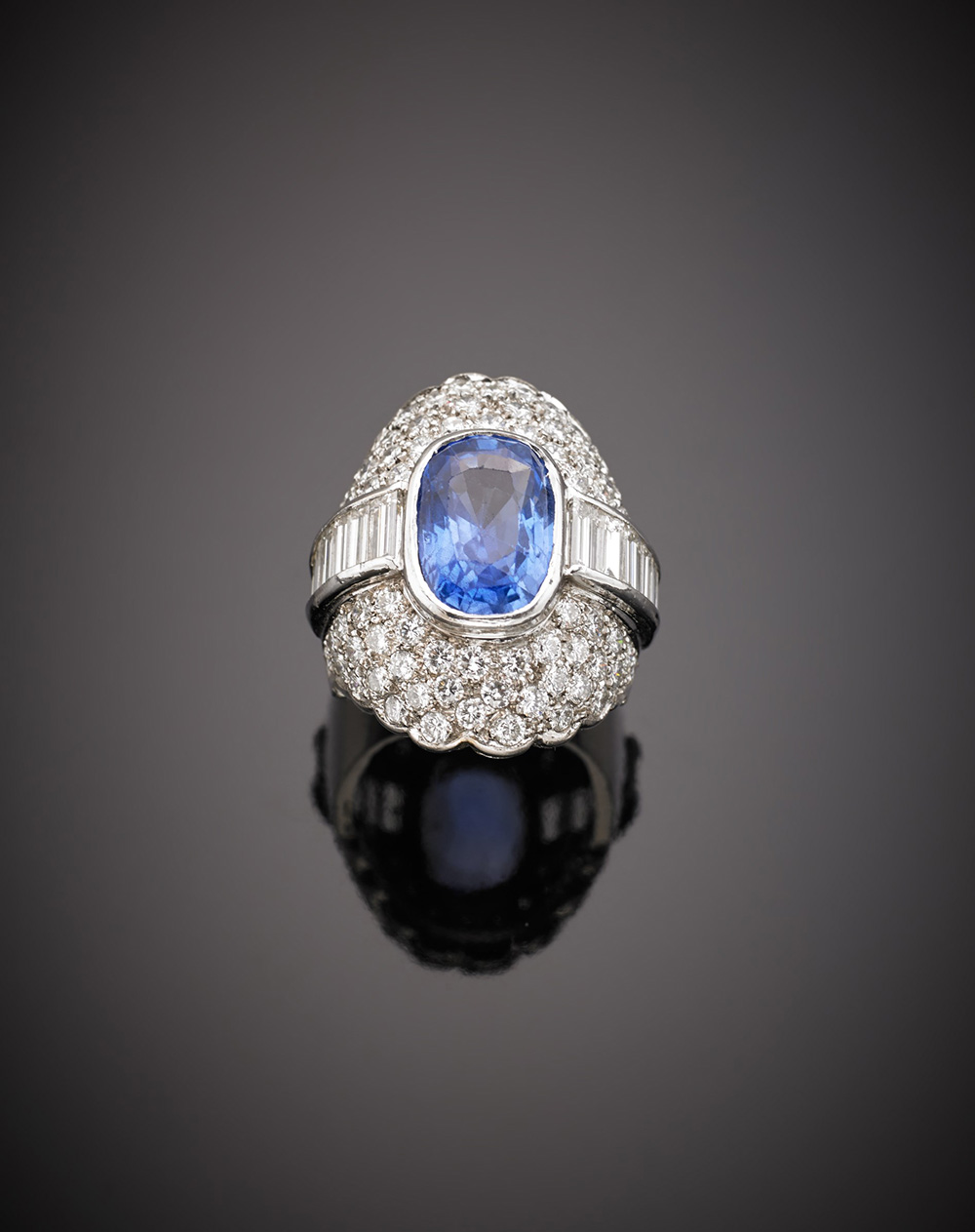 Anello in oro bianco con diamanti a pavè e baguette a contornare uno zaffiro ovale di ct.8,50circa, g.22,10 misura 15/55 Accompagnato da report Gemmologico CISGEM n.6056 Milano 06/04/2017 White gold round and baguette diamond dome ring centered by a ct.8,50 oval sapphire, g.22,10 size 15/55 Appended CISGEM Gemmological Report n.6056 Milano 06/04/2017