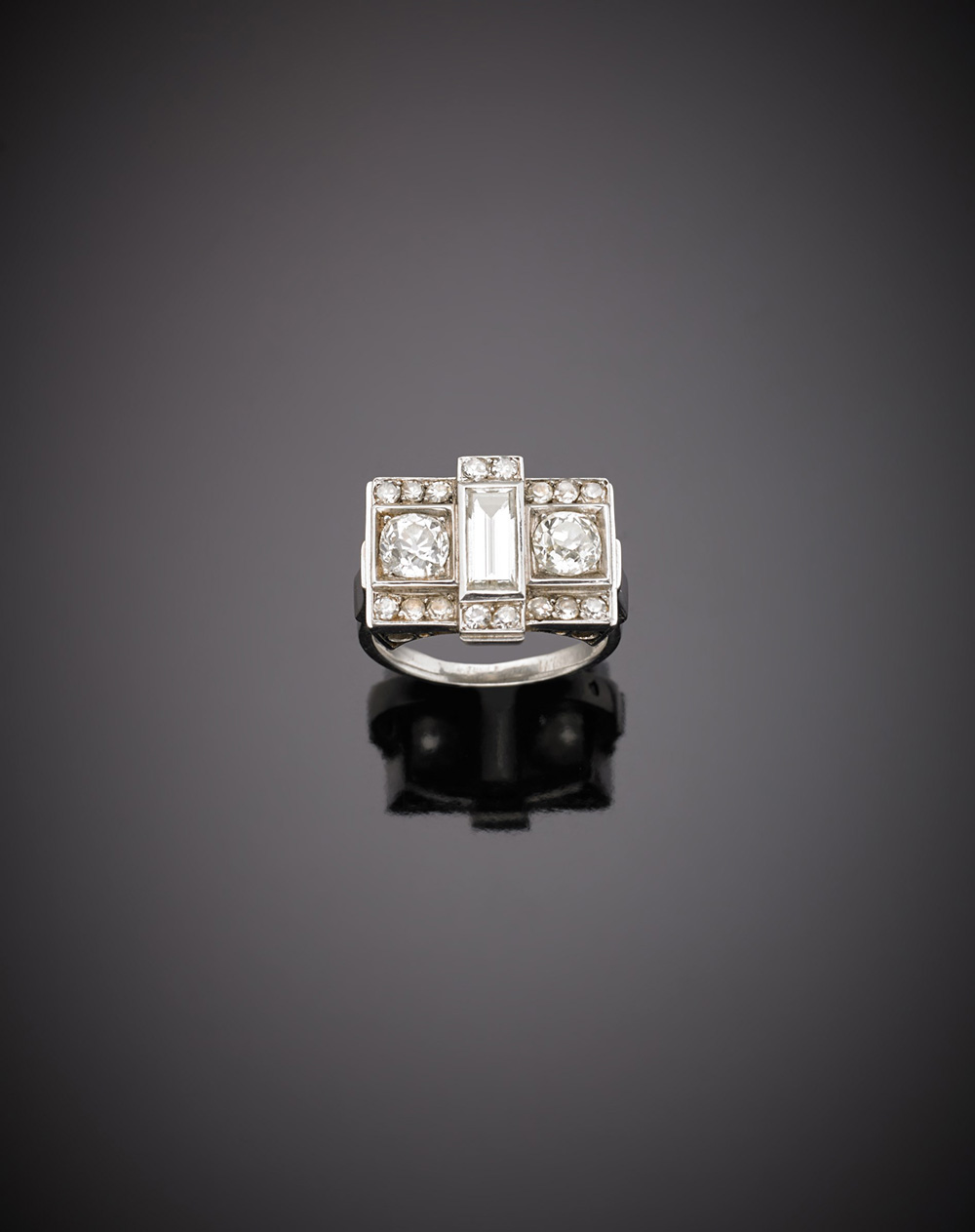 Anello geometrico in oro bianco con diamanti rotondi e a baguette, centrali complessivi ct 2,00 circa, g.10,00 misura 14/54 White gold round and baguette cut diamond geometric ring, the centrals in all ct 2,00 circa, g.10,00 size 14/54