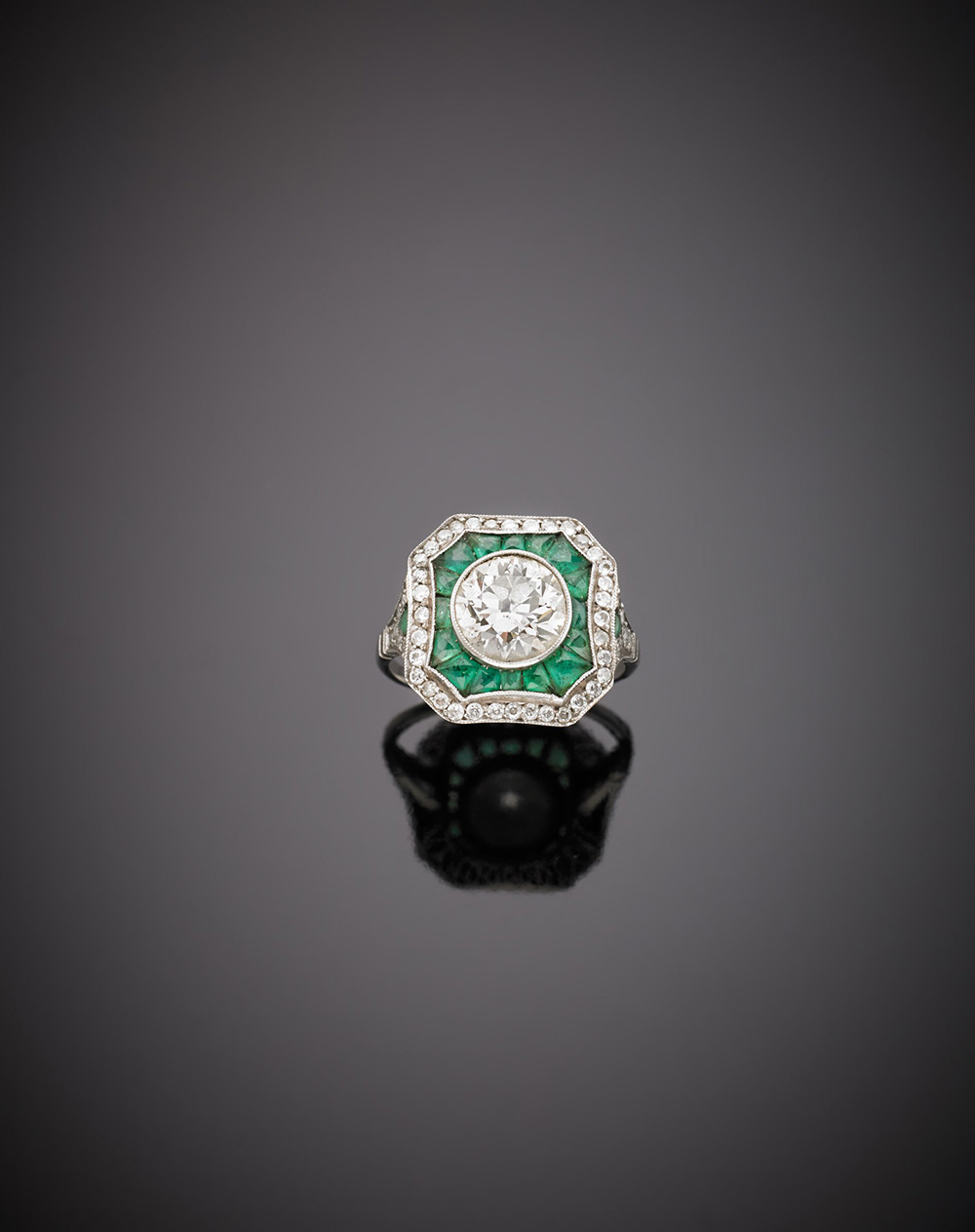 Anello in platino con diamante rotondo centrale di ct.1,70 contornato da diamanti e smeraldi tapered, g.4,40 misura 14/54
