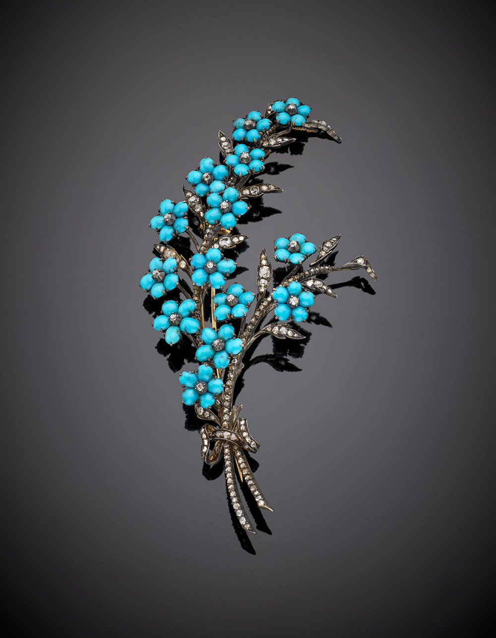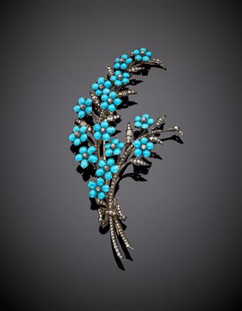 Spilla floreale in oro giallo e argento con turchesi e diamanti g.35,40 lungh. cm 12 circa (difetti, mancanze) Yellow gold, silver, diamond and tuquoise floral brooch, g.35,40 length cm 12 circa (defect and losses)