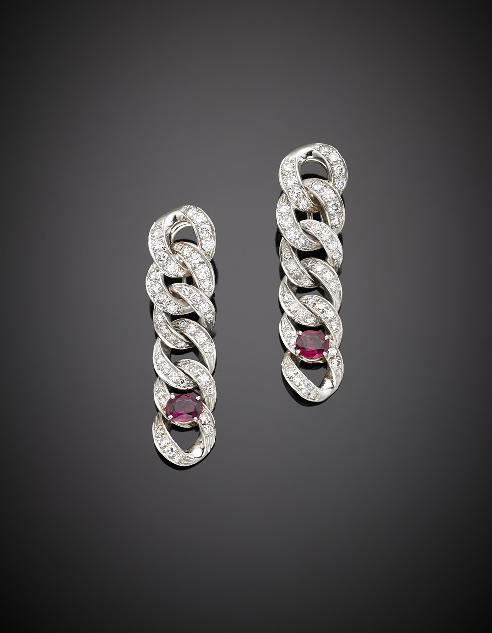 Orecchini pendenti con clip in oro bianco a maglia groumette e diamanti ,...