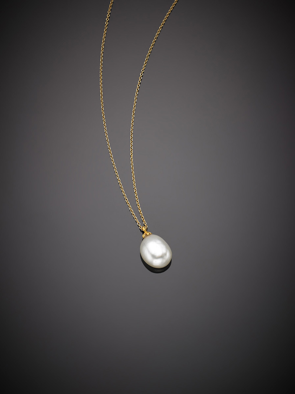 Catenina in oro giallo con perla naturale d'acqua salata, bianca, a goccia di mm 14,60x11,59x7,71, g.4,50 lungh. catenina cm 44,5 Accompagnato da analisi gemmologica CISGEM n. 2818 del 09/03/2017, Milano Natural salt water white pearl drop, mm 14,60x11,59x7,71, with yellow gold linkchain, g.4,50 chain length cm 44,5 Appendedn Gemmological report CISGEM