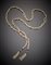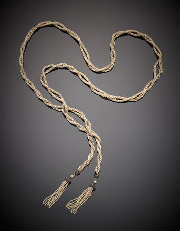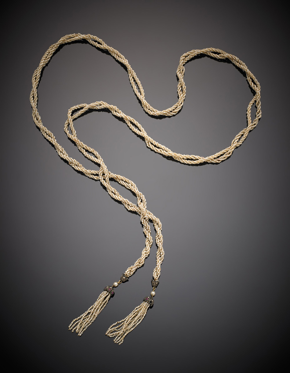 Saliscendi intrecciato di microperle naturali terminate a nappa, rifinite con coppette in argento con diamanti irregolari e rubini cabochon, g.34,80 lungh. cm 115 circa Woven natural micro-pearl rope sautoir, ending with silver, diamond and ruby cup tassels, g.34,80 length. cm 115 circa