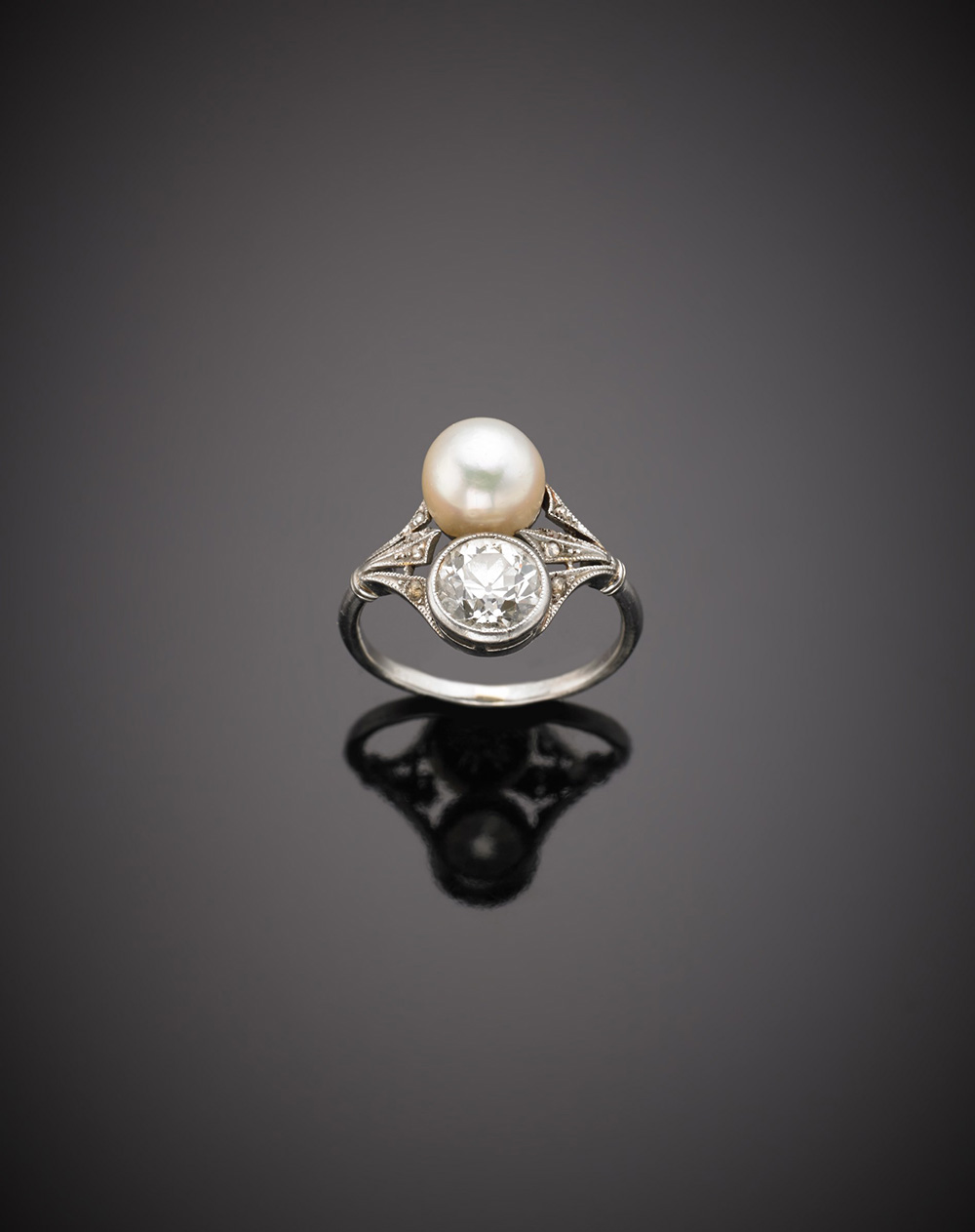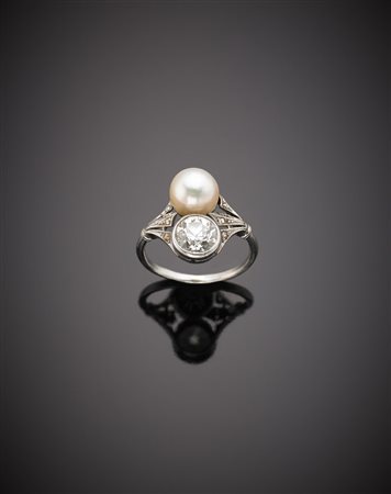 Anello in platino con diamante di ct.1,20 e perla di mm 8,20 circa, g.5,10 misura 14/54 Platinum ct.1,20 diamond and pearl ring, g.5,10 size 14/54