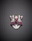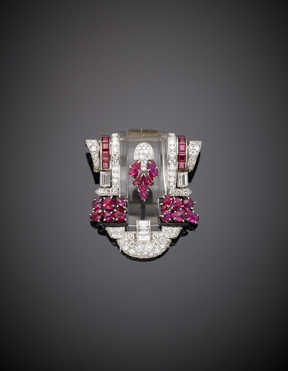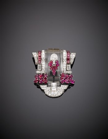 Broche in platino, quarzo ialino e smalto nero a guisa di cartiglio con diamanti rotondi e baguette, rubini scolpiti e carrè, g.45,60, lungh. cm 4,80, largh. cm 4,40 Platinum hyaline quartz, black enamel, diamond, carved and carré ruby scroll brooch, g.45,60, length cm 4,80, width cm 4,40