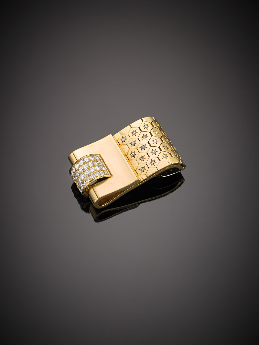 VAN CLEEF & ARPELS Broche in oro giallo e diamanti, a cartiglio con motivo a nido d'ape "Ludo hexagon", g.30,00 lungh. cm 4,5 circa VAN CLEEF & ARPELS Yellow gold and diamond "Ludo Hexagon" scroll clip brooch, g.30,00 length cm 4,5 circa