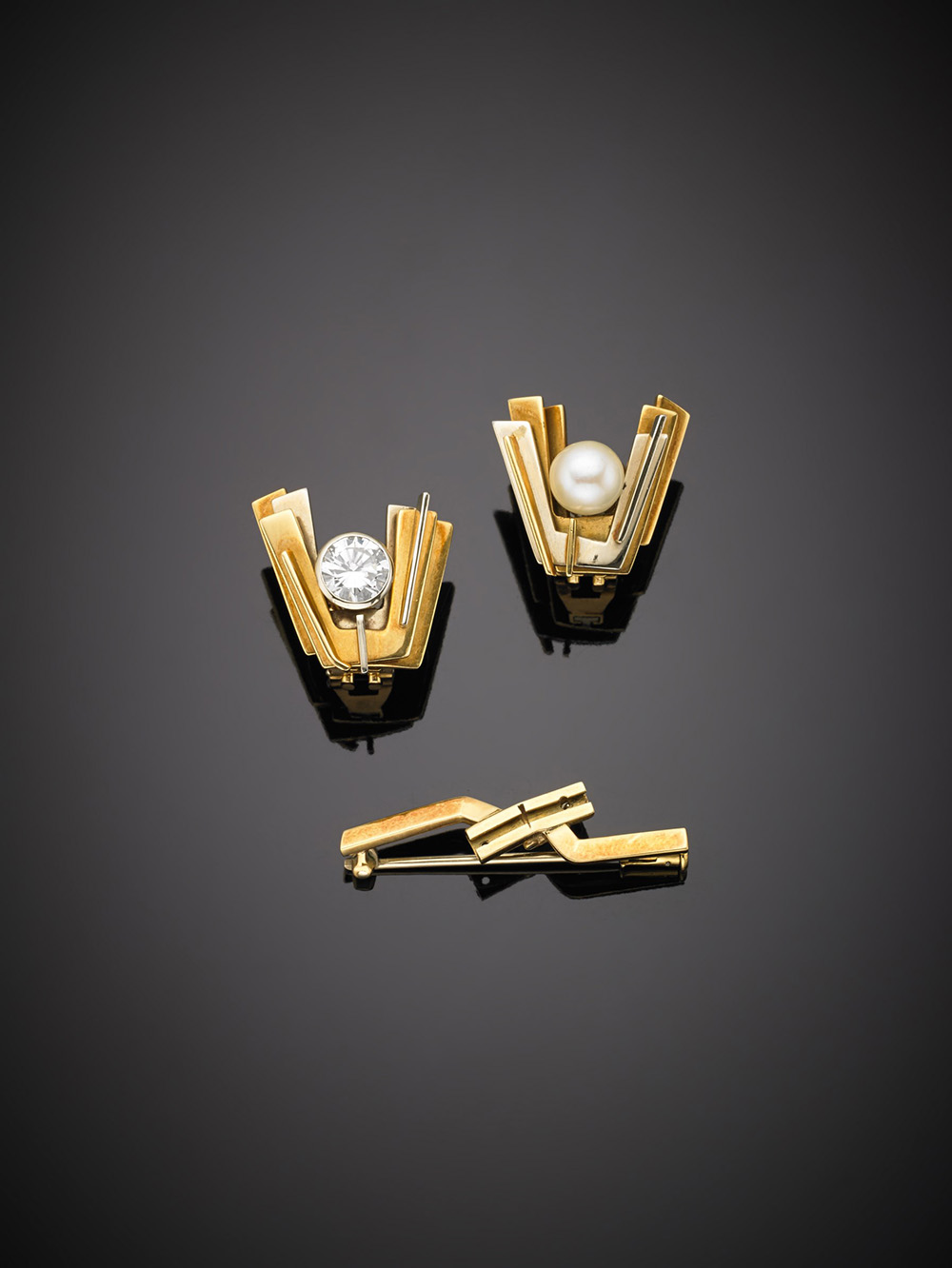 CUSI Orecchini in oro giallo perla e diamante di ct.1,30 circa con accessorio per modificarli in spilla, complessivi g.24,30, in astuccio originale CUSI Yellow gold pearl and ct.1,30 diamond earrings with brooch converter, in all g.24,30, in original CUSI pouch
