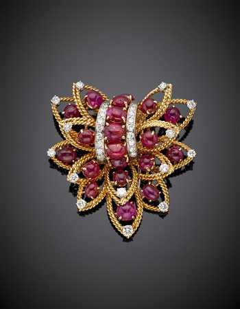Spilla in oro giallo e bianco con rubini ovali cabochon rifinita con diamanti...