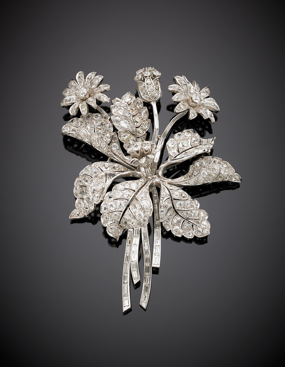 Grande broche in platino a guisa di mazzo di fiori e diamanti per complessivi ct.23,00 circa, g.69,7 lungh. cm 9,5 largh .cm 7 circa (mancanze) Important platinum and diamond bouquet brooch, diamond in all ct.23,00 circa, g.69,70 length cm 9,5 width cm 7 circa (losses)