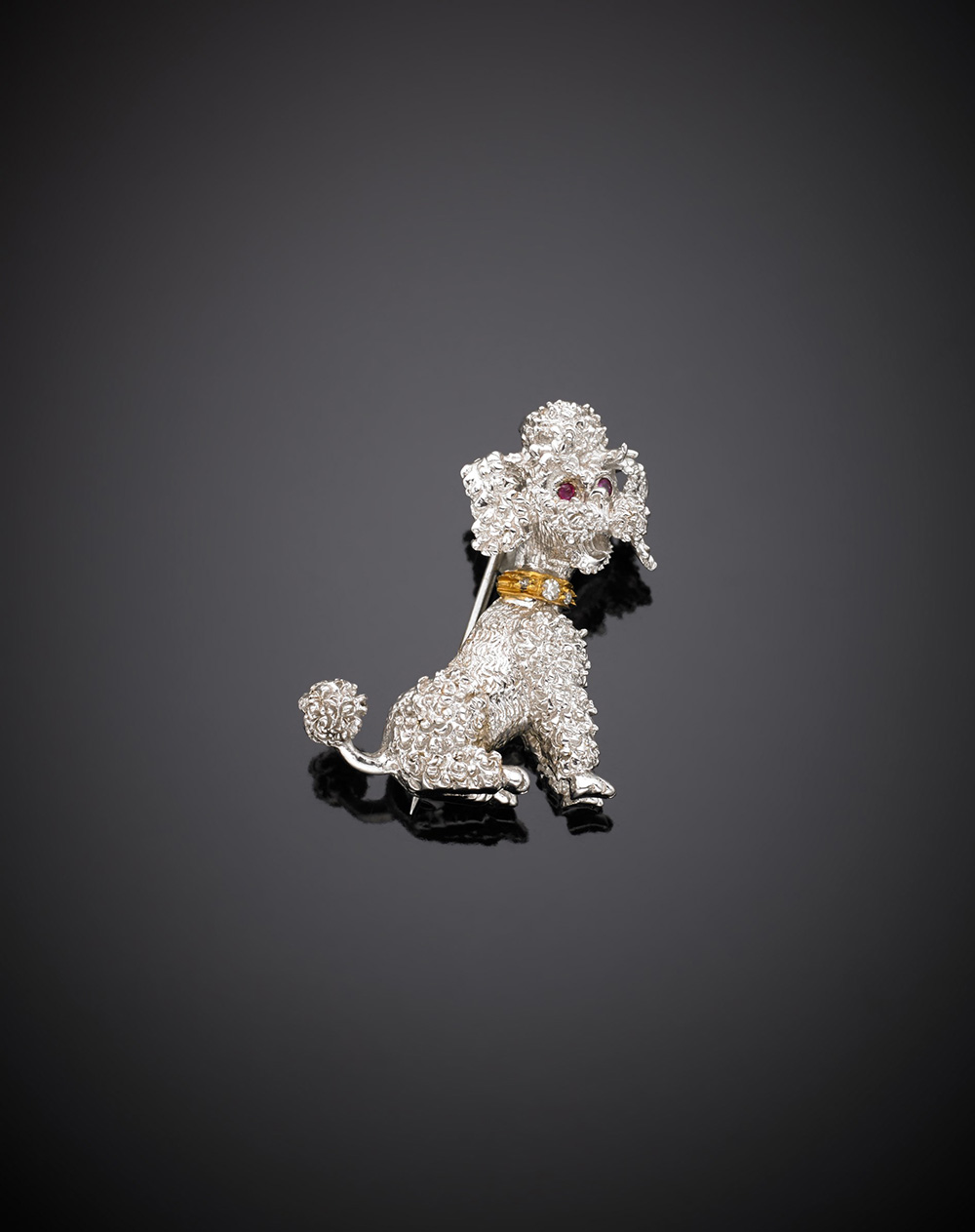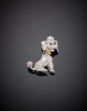 Spilla a guisa di barboncino in oro bianco e giallo rifinito con rubini e...