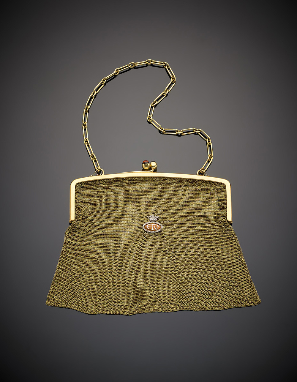 Borsetta da sera in oro a maglia con scudo nobiliare e cifre in platino diamanti e smalti, g.228,00 Yellow gold mesh evening bag with platinum diamond and enamel family crest, g. 228,00