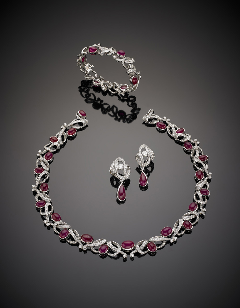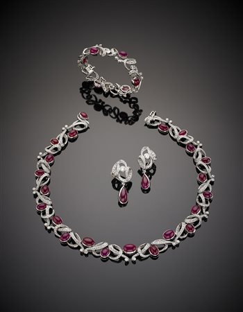 Demi-parure composta da collier con pendente, bracciale e orecchini in platino con diamanti e rubini cabochon ovali e a goccia per complessivi ct.161,00 circa, g.220,40, lungh. collier cm 46, bracciale cm 18 e orecchini cm 4,8 circa White gold diamond and cabochon ruby set composed of necklace with pendant, bracelet and earrings, ryby in all ct.161,00 circa g.220,40, necklace length cm 46, bracelet cm 18 and earrings cm 4,8 circa