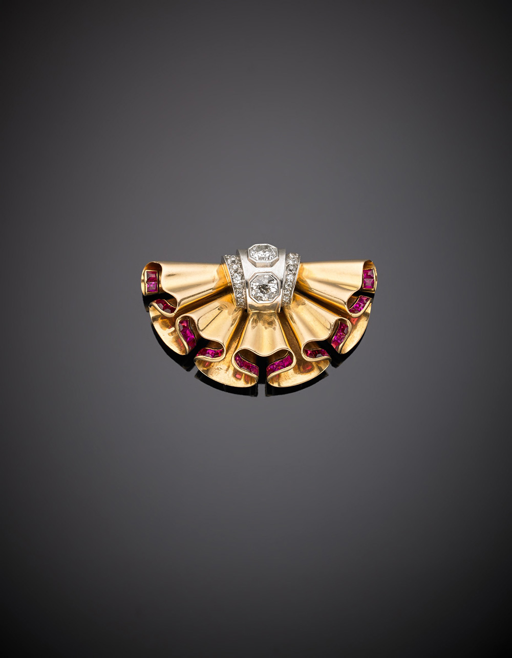 RENE' BOIVIN Broche in oro giallo e platino con diamanti rotondi e rubini...