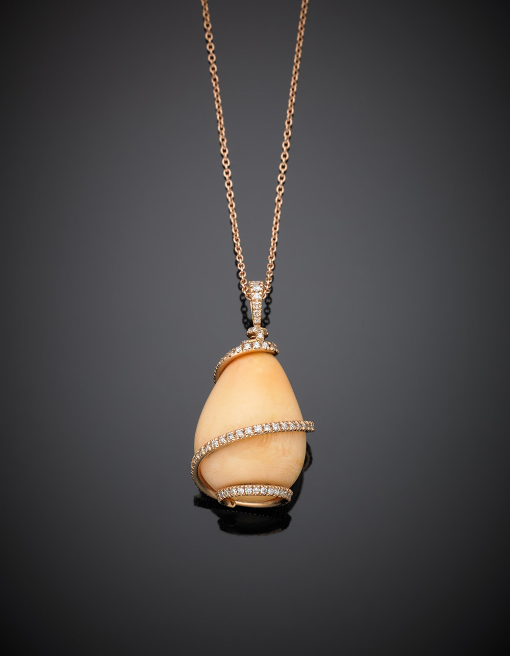Natural orange yellow non-drilled Melo-Melo pearl drop of ct. 39,90 mm 16,06x16,28, h mm 22,37, bound as a pendant in pink gold and diamond with a linkchain, g. 12,60