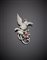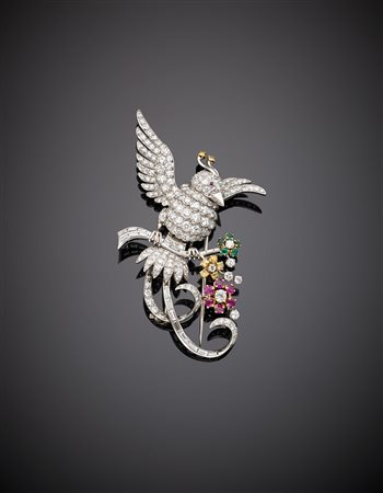 MAUBOUSSIN Broche in platino e oro a guisa di uccello del paradiso su ramo fiorito con diamanti incolori e fancy, rubini e smeraldi, g.23,30, lungh. cm 7,50 circa. Punzonato "Depose 22M", MAUBUSSIN, "testa d'aquila" e "testa di cane" MAUBOUSSIN Platinum and gold, colourless and fancy diamond, ruby and emerald bird-of-paradise brooch, g.23,30, length cm 7,50 circa. Marked "Deposé 22M", MAUBUSSIN, "eagle head" and "dog head"