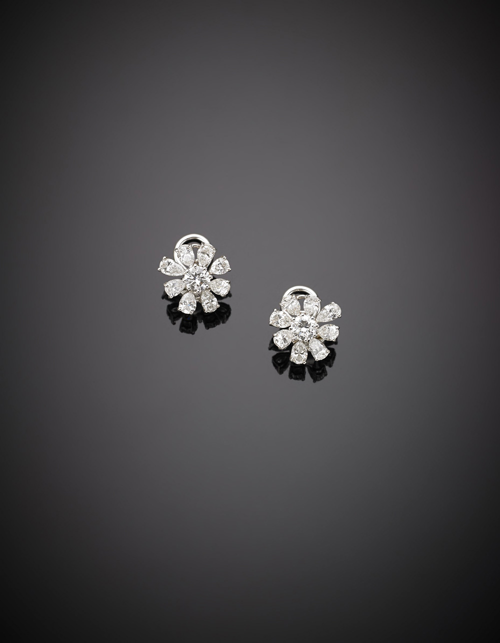 Orecchini in oro bianco con diamanti a goccia e tondi a formare i fiori, complessivi ct.3,80 g.6,00 White gold diamond flower earrings, in all ct.3,80 g.6,00