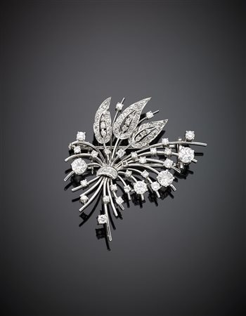Spilla in oro bianco a guisa di ramo fiorito con diamanti rotondi per complessivi ct.3,30 circa, g,20,20 lungh. cm 5,50 circa White gold diamond flower branch brooch, in all ct.3,30 circa, g.20,20 length cm 5,50 circa