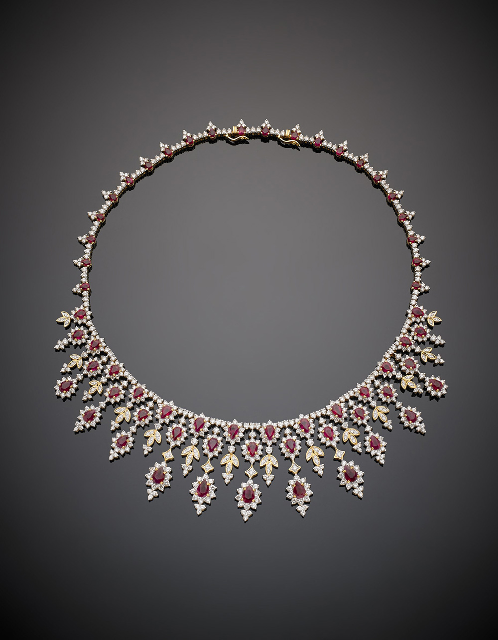 Collier in oro giallo e bianco diamanti rotondi e rubini a goccia, rubini per complessivi ct.23,00 circa g.80,80 lungh, cm 41 circa, h. al centro cm 4 circa Bi-coloured gold round diamond and pear ruby necklace, ruby in all ct.23,00 circa g.80,80 length cm 41 circa, center h cm 4 circa