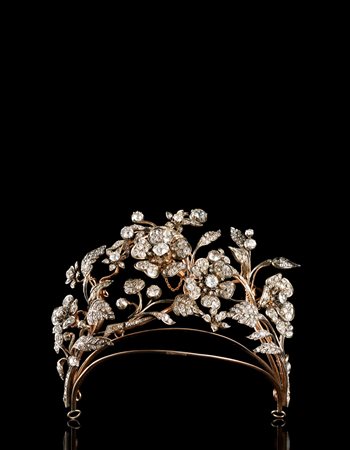 Diadema in oro rosso, argento e diamanti con fiori "en tremblant", smontabile ed alcuni indossabili come tre spille floreali o spilloni per capelli, per complessivi ct.35 circa g.111,70. accessori a parte (mancanza) Red gold, silver diamond "en tremblant" flower diadem, detachable and wearable as flower brooches or hair-pins, in all ct.35 circa g.11,70. And accessories, (losses)