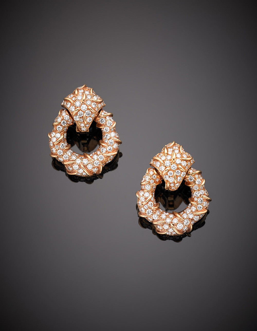 TIFFANY&CO Orecchini pendenti in oro rosso e diamanti con motivo ad intreccio, g.41,60, lungh. cm 3,80 circa (un diamante mancante) TIFFANY&CO Red gold diamond woven pendant earrings, g.41,60, length cm 3,80 circa (diamond loss)