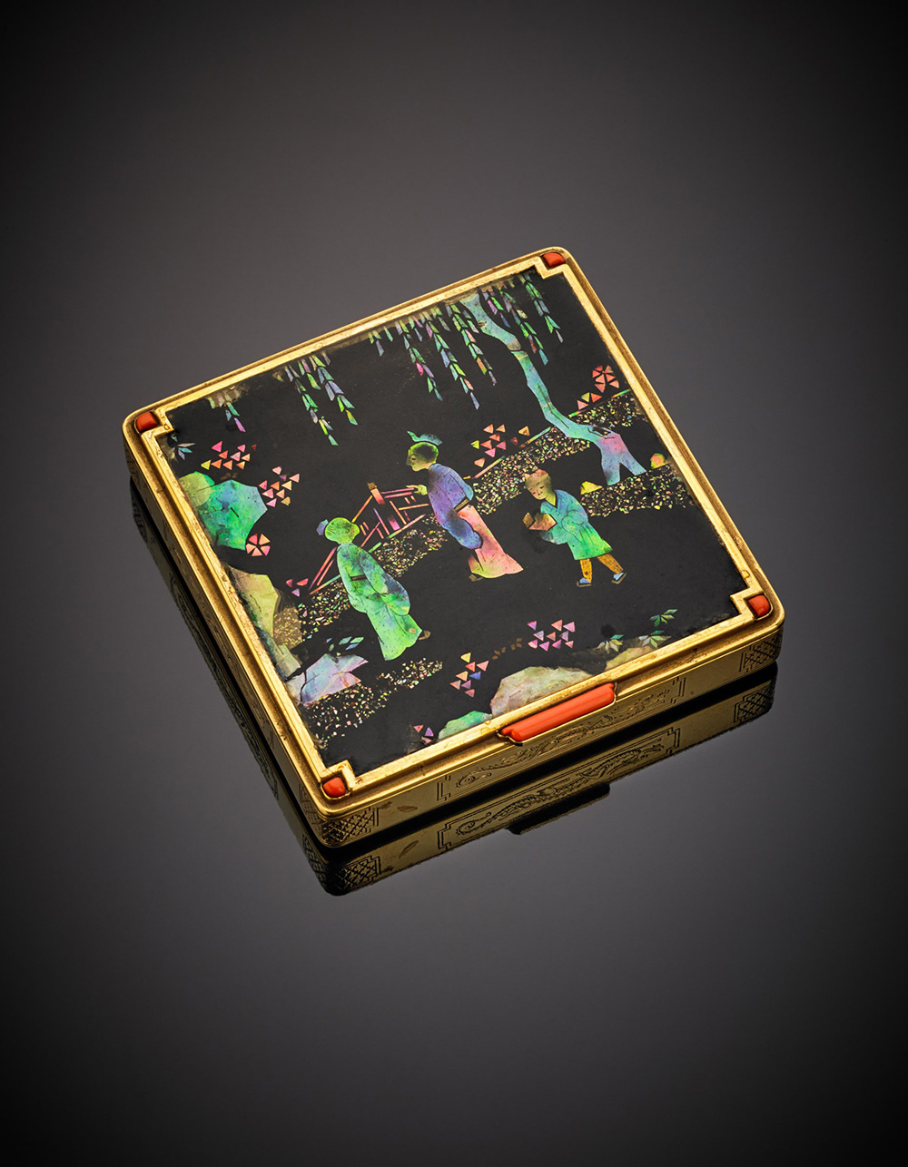CARTIER Box in oro giallo in lacca con coperchio ad intarsio orientale in madreperla rifinita in corallo arancione, fondo in agata, g.152,0, misure cm 8,0x8,0x1,6 circa (lievi difetti). Punzonata Cartier, Paris, Londres, New-york made in France CARTIER Yellow gold box with oriental style mother-of-pearl inlaid lid, coral details, agate bottom, g.152,0 measurements cm 8,0x8,0x1,6 circa (minor defects). Marked Cartier, Paris, Londres, New-york made in France