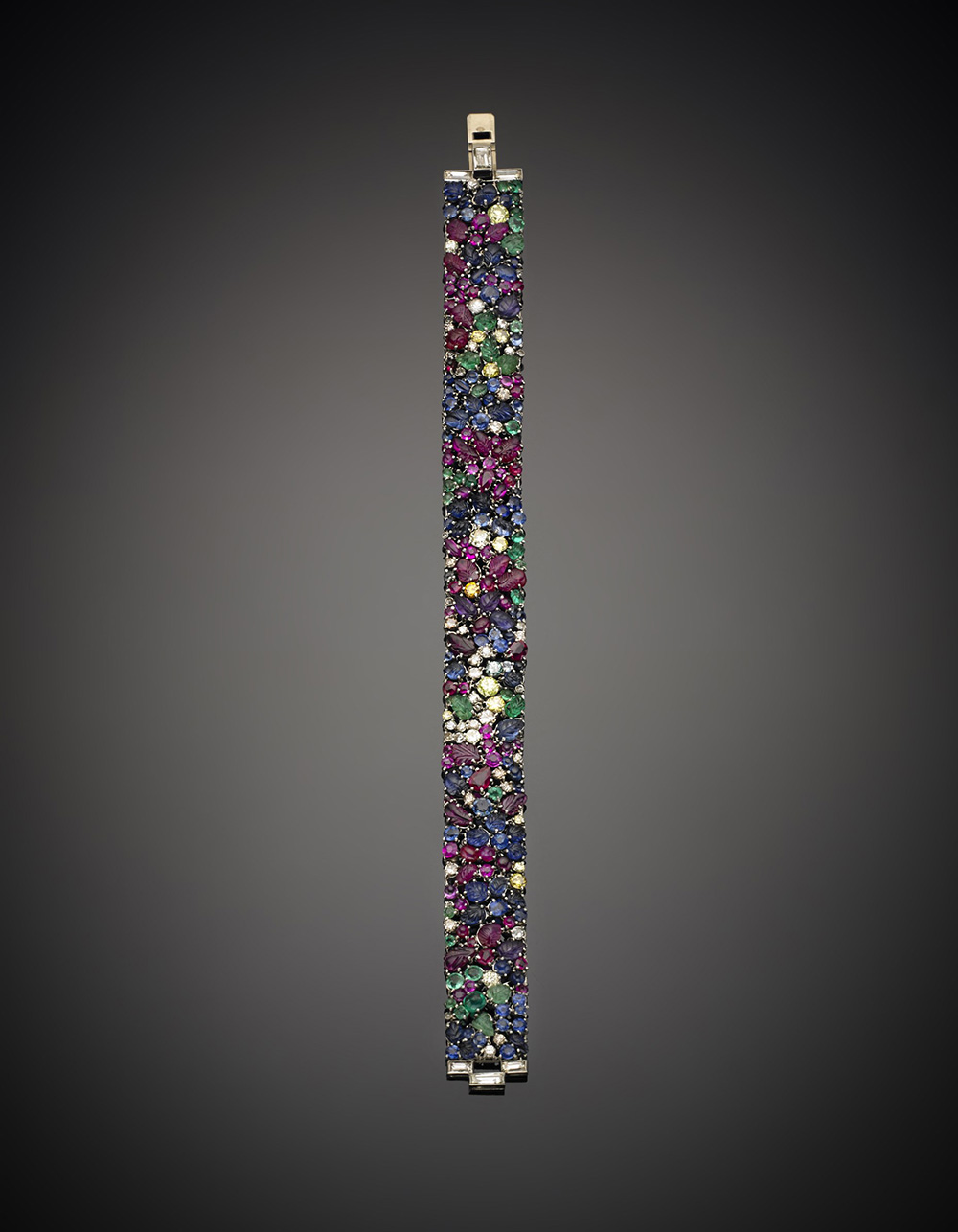 Bracciale in platino "tutti i frutti" con rubini, smeraldi e zaffiri...