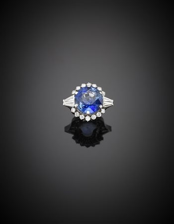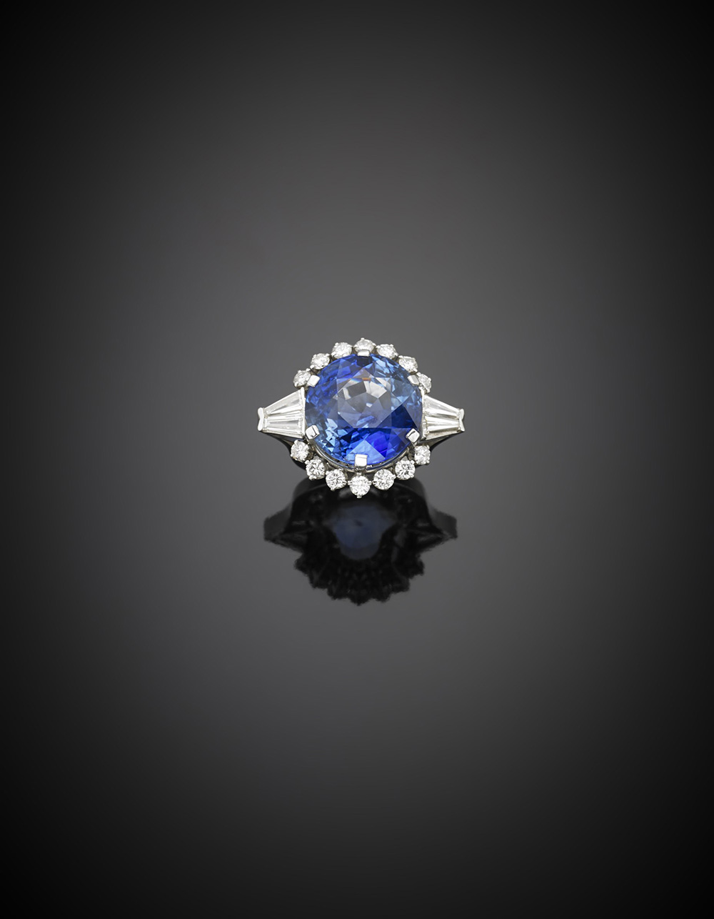 Anello in platino con zaffiro birmano ovale taglio composito di ct 26,38, contornato da diamanti rotondi e tapered, g. 16,90, misura 11/51 Accompagnato da analisi gemmologica SSEF n. 88045 del 28/09/2016, Basilea, che accerta la provenienza Birmana senza indicazioni di trattamento Platinum round and tapered diamond ring with a ct.26,38 oval mixed cut Burma sapphire, g.16,90 size 11/51 Appended SSEF Gemmological Report n. 88045 Basel 28/09/2016, stating the provenance and the absence of indication of any heat treatment