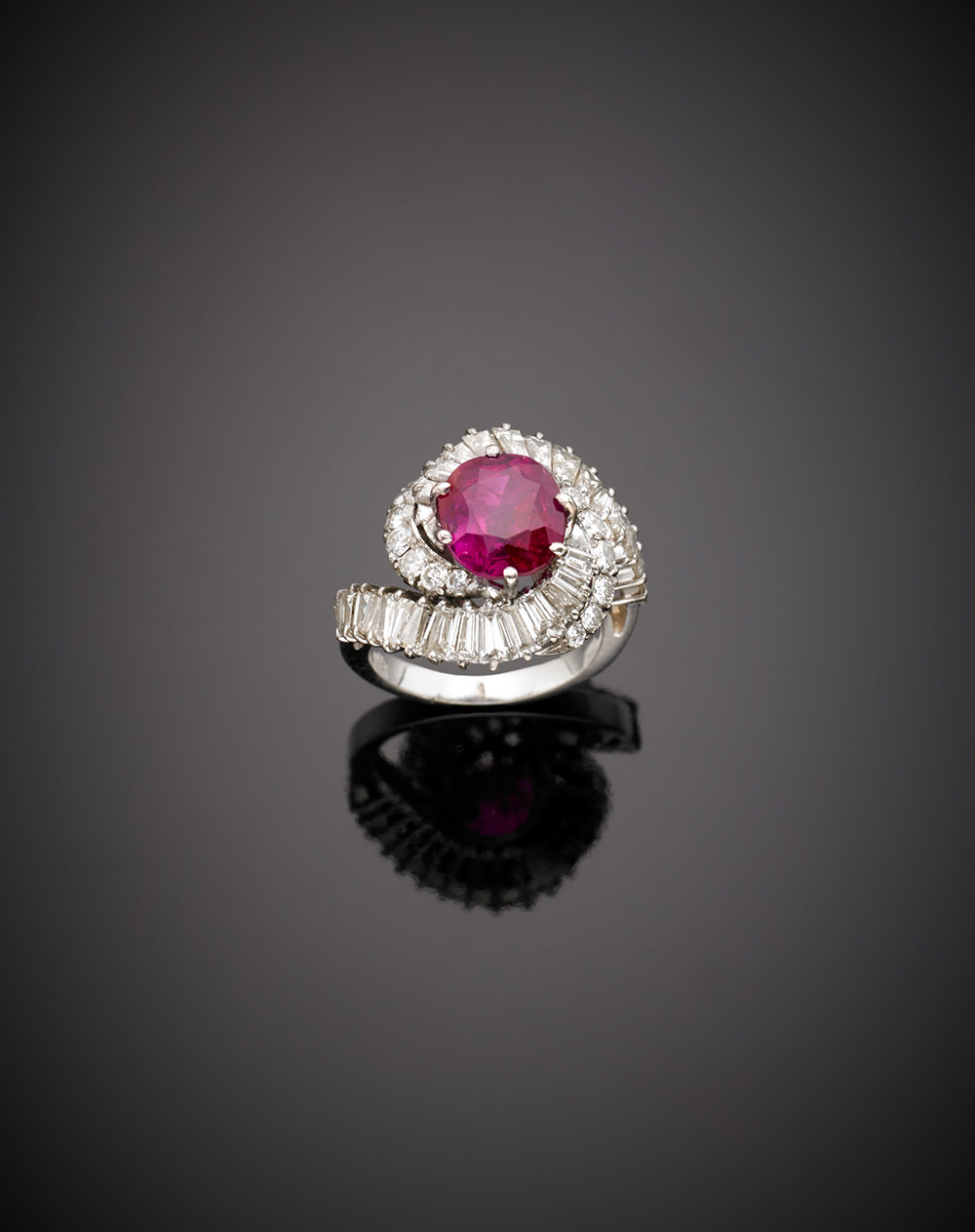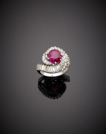 Anello in oro bianco con rubino ovale taglio composito di ct.3,60 circa, contornato da diamanti a baguette e rotondi g. 7,80, misura 10/50 Accompagnato da Report Gemmologico CISGEM n. 6035 Milano 06/04/2017 White gold diamond ring with oval ruby of ct. 3,60 circa g. 7,80 size 10/50 Appended CISGEM Gemmological Report n. 6035 Milano 06/04/2017