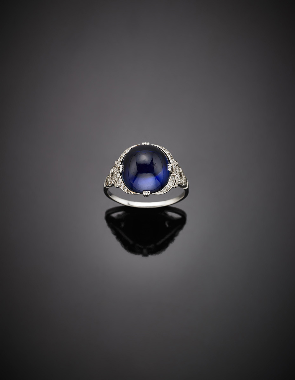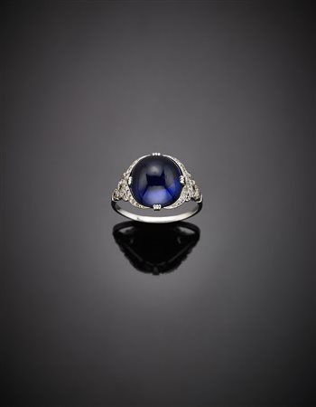 Anello in platino con al centro uno zaffiro di forma a cuscino taglio cabochon di ct 9,50 circa, g. 4,90, misura 16/56 Accompagnato da analisi gemmologica CISGEM n. 5936 del 29/03/2017, Milano Platinum ct.9,50 circa sugar loaf sapphire ring, g.4,90 size 16/56 Appended CISGEM Gemmological report n. 5936 Milano 29/03/2017