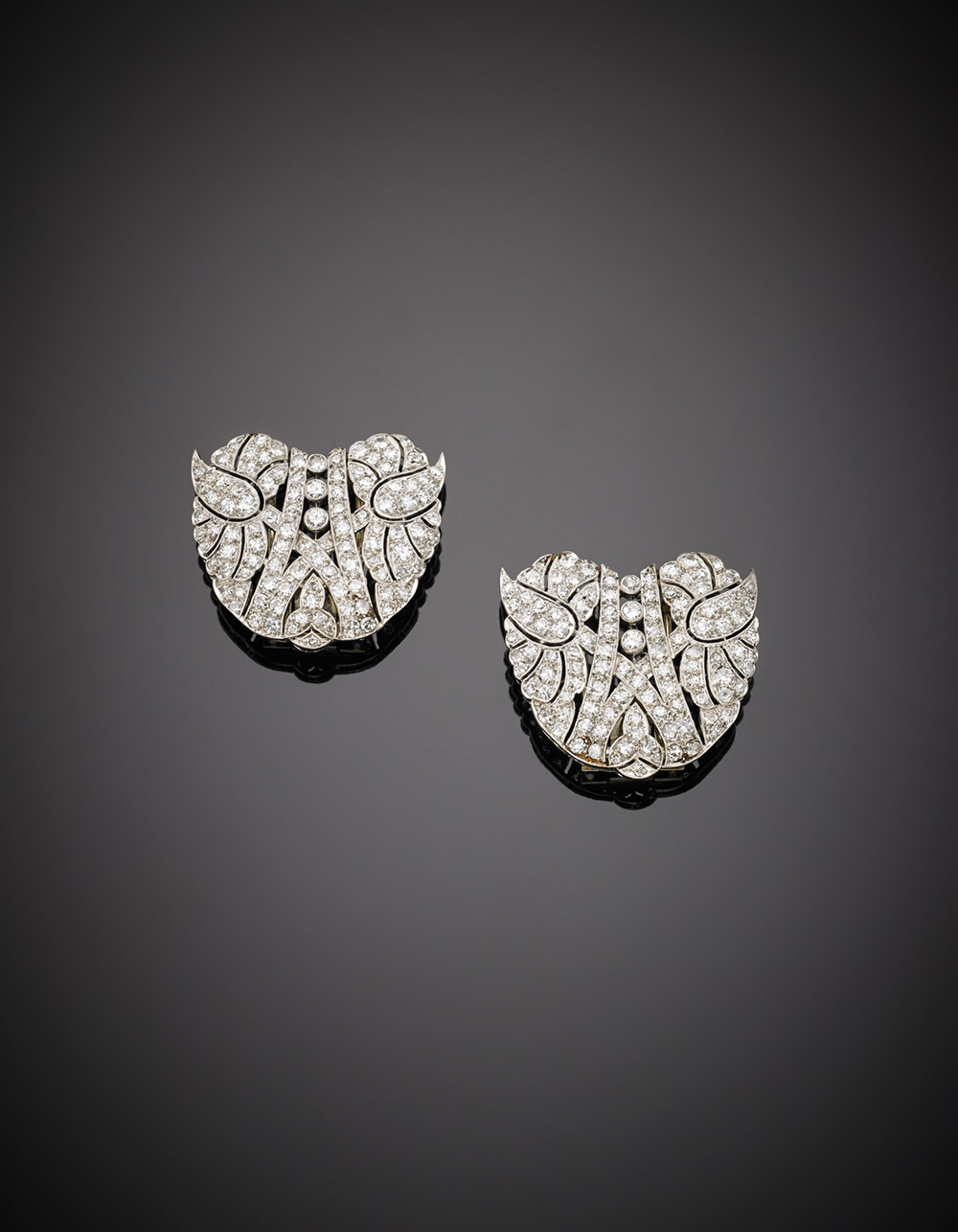 Doppia broches in platino e oro bianco con diamanti rotondi, g. 26,60,...