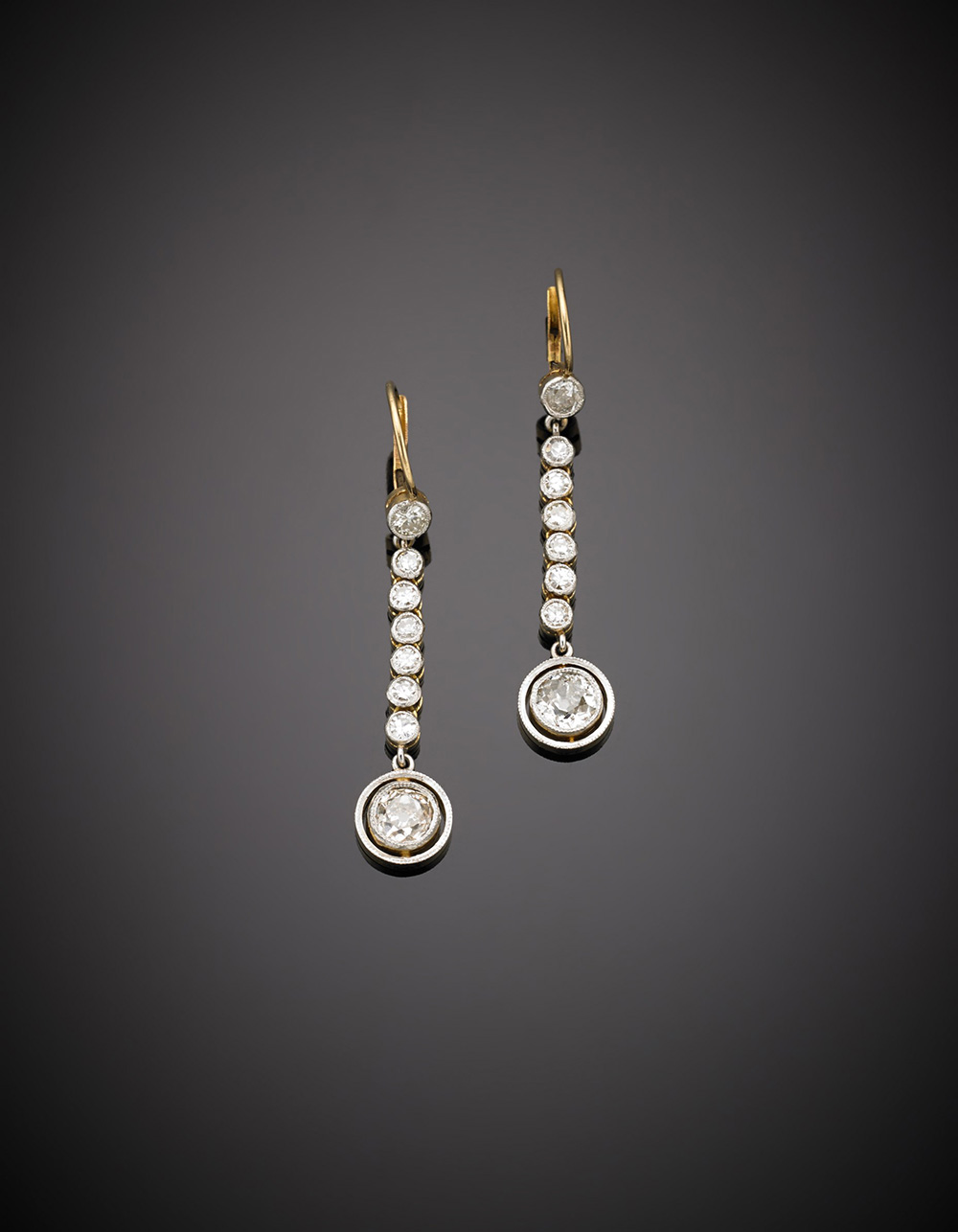 Orecchini pendenti in oro giallo e bianco ognuno con otto diamanti dei quali il più grande finale di ct 0,60 circa, g. 6,30, lungh. cm 4,50 circa (difetto nella chiusura) Bi-coloured gold diamond pendant earrings, the ending diamond ct. 0,60 circa, g.6,30 length cm 4,5 circa (defect in the catch)