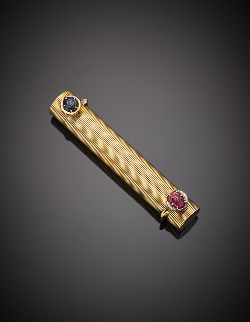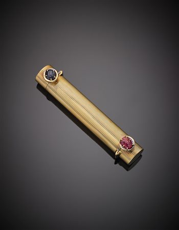 CARTIER PARIS Portarossetto in oro giallo a doppio scomparto, con aperture rifinite con zaffiro e rubino, entrambi scolpiti a foglia, g. 96,20, lungh. cm 10 circa. Marcato 0871, BREVETE' SSDG e altri punzoni fancesi. In scatola originale CARTIER PARIS Yellow gold double end lipstick compact, with a leaf carved ruby and sapphire clasp, g. 96,20, length. cm 10 circa. French hallmarks and 0871, BREVETE' SSDG. With original case
