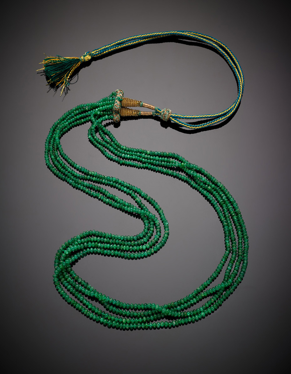 Collana a scalare a quattro fili di boules di smeraldi rifinita in tessuto, g. 38,50 Four strand graduated emerald bead necklace, fabric details, g.38,50