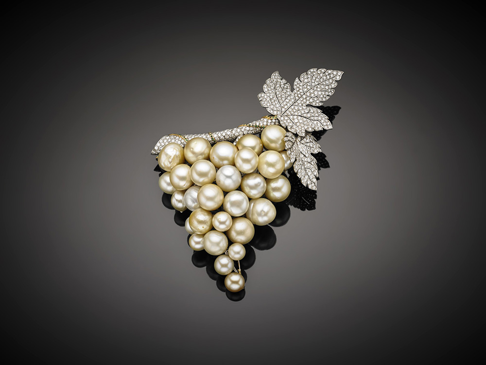 Grande broche a guisa di grappolo d'uva in oro bianco, giallo, diamanti e smeraldi con perle coltivate South-sea da bianche a light gold, da mm 9 a mm 16 circa, a formare il grappolo. Con catena in metallo e oro per utilizzarlo come pendente, g. 182,40, cm 11x12,50 circa. Firma non leggibile Bi-coloured gold, from white to light gold mm 9-16 circa South-sea pearl, diamond, emerald grape bunch brooch, with metal and gold linkchain to use as pendant, g. 182,40, cm 11x12,50 circa. Unreadable sign