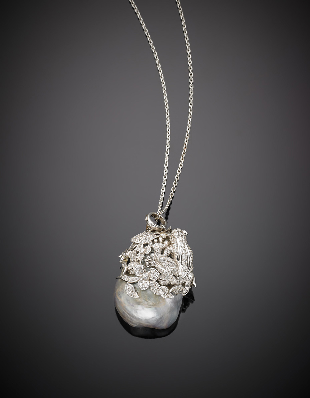 Pendente in oro bianco con disegno fauna e flora a pavé di diamanti a tenere una grande perla barocca grigia rifinito con catena, g. 58,70, pendente cm 4,5x2,5x2,80 circa Great, grey hued baroque pearl in a white gold diamond pavé flora and fauna design pendant with linkchain, g. 58,70, pendant cm 4,5x2,5x2,80 circa