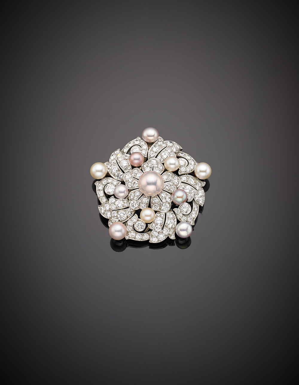 BULGARI Broche/pendente in oro bianco con diamanti rotondi taglio a brillante e perle coltivate dal bianco al grigio e al rosa, g. 27,90, diam. cm 4,5 circa BULGARI White gold, round diamond and white, pinkish , greysh cultured pearl pendant brooch, g. 27,90, diam. cm 4,5 circa
