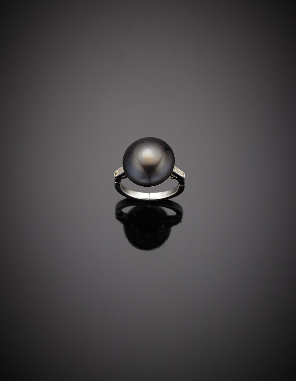 Anello in oro bianco con perla coltivata nera a bottone e due diamanti a baguette, g.8,20, misura 13/53 e regolabile White gold black cultured pearl and diamond baguette ring, g.8,20, size 13/53 adjustable