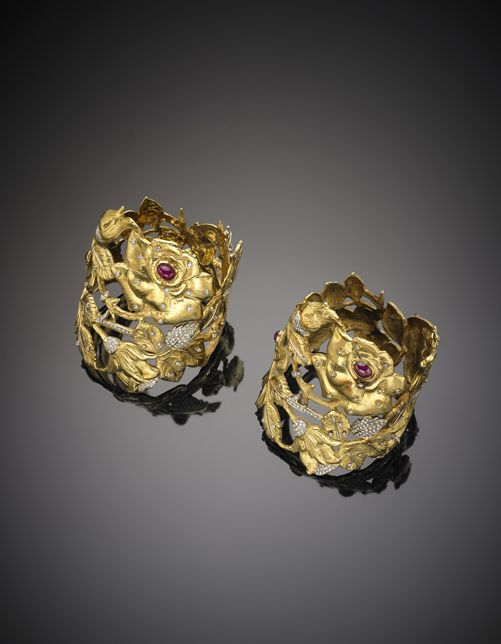 Coppia di bracciali rigidi a disegno floreale in oro giallo e bianco, con diamanti rotondi taglio a brillante e rubini ovali cabochon, g. 302, massima h cm 8 circa Pair of bi-coloured gold round diamond, oval cabochon ruby, openwork floral cuff bracelets, g. 302, max h cm 8 circa