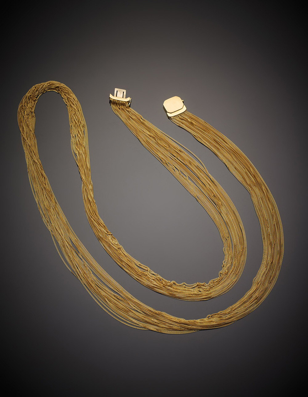 Catena lunga in oro giallo a multi fili di maglie grumette sottili, g. 95,60, lungh. cm 90 circa Long multi-strand groumette chain necklace, g. 95,60, length cm 90 circa