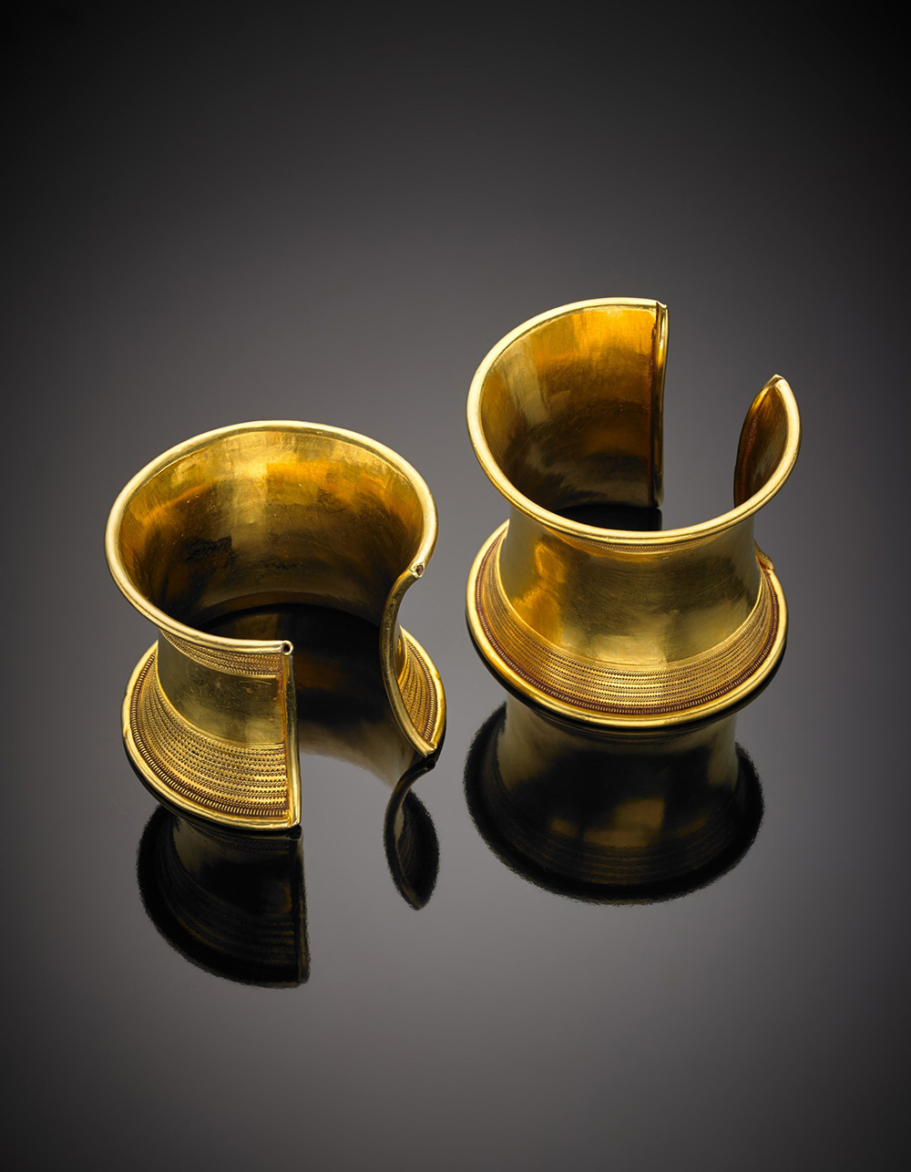 Coppia di bracciali rigidi alla schiava in oro giallo con zigrinature ai bordi di sapore nordafricano, g. 232,90, h cm 6 e h cm 7 circa Pair of yellow gold "North African" edge work cuff bracelets, g.232,90, h cm 6 e h cm 7 circa