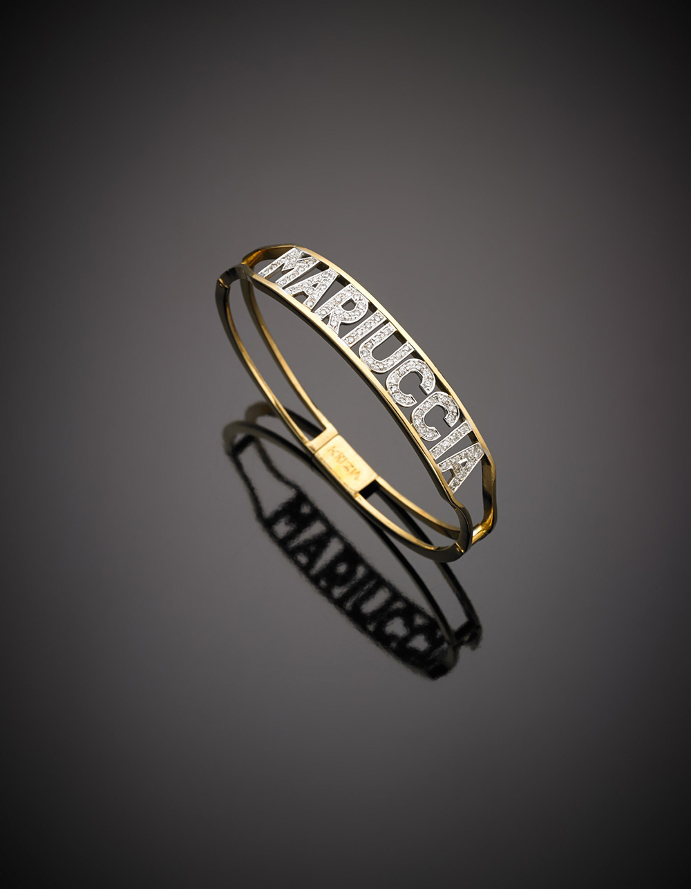 Bracciale rigido in oro giallo con il nome "MARIUCCIA" in oro bianco e diamanti, all'interno incisione logata KRIZIA, g. 26,80 Yellow gold cuff bracelet with "MARIUCCIA" in white gold and diamond, inside logo inscription KRIZIA, g.26,80