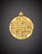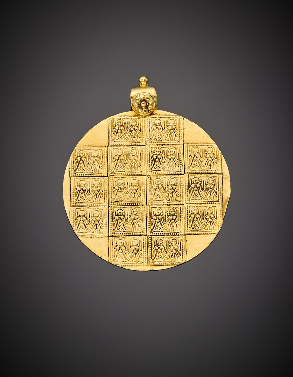 Grande pendente rotondo in oro giallo decorato con figure etniche, g. 42,80, diam. cm 6,80 (difetti)