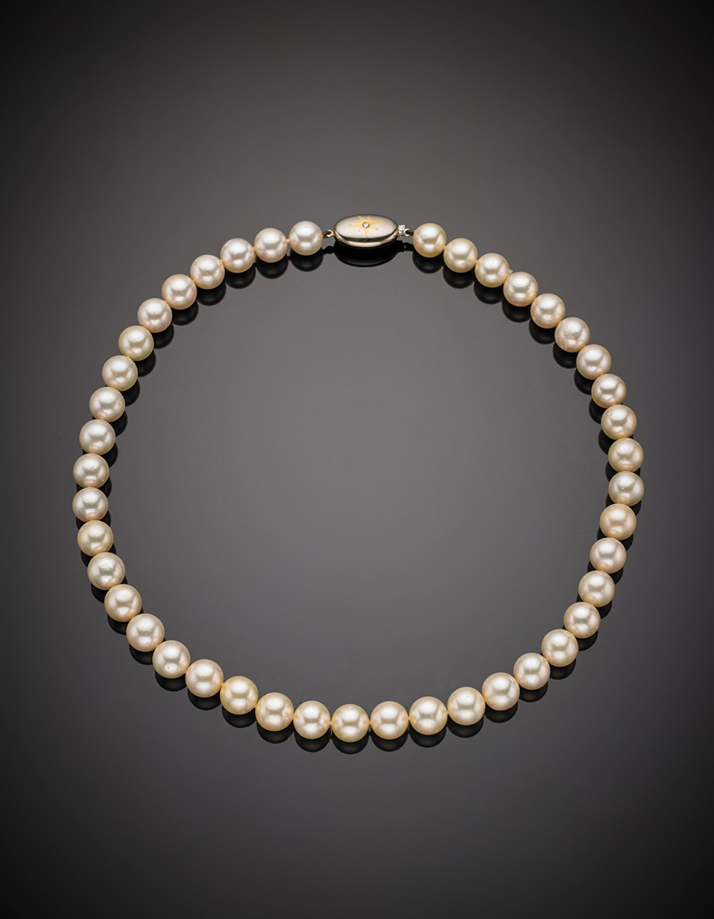 Collana di perle coltivate bianche/crema di mm 9,5 circa, con chiusura in oro bianco e due diamanti rotondi, g. 57,80, lungh. cm 44,5 circa Cream white mm 9,5 cultured pearl necklace, white gold two diamond clasp, g.57,80, lungh. cm 44,5 circa